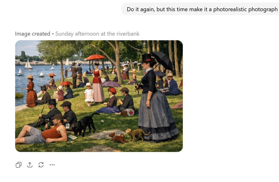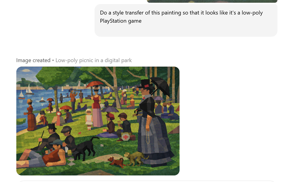 Another class of AI models are generative image models. Since quizbowl is mostly a written and spoken medium, these don’t have a ton of obvious use cases for quizbowl apart from small things like “make me a distinct icon for my Discord playtesting server.” However, there are some possibilities of employing these models in visual tournaments such as Eyes that Do Not See. For instance, you might use a combination of multi-modal and image gen models to do a proofreading / correction pass for text such as signatures or foreign language phrases (“identify the country”) that can be accidental giveaways. They also allow for more out-there ideas such as “do a style transfer of this painting” that might allow you to test for knowledge of the composition of a painting for an artist whose style is super distinct such as Pointillist Georges Seurat: