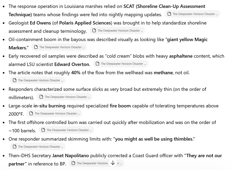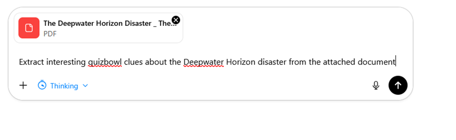 For example, years ago I read a great New Yorker article on the Deepwater Horizon disaster. I can remember this article being packed with interesting details that could make good clues. I saved the article as a PDF and sent this simple prompt to ChatGPT: