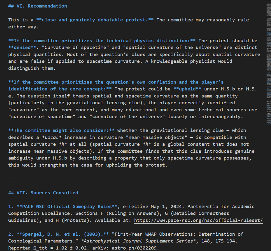 At big tournaments such as the PACE NSC, protest resolution is a complicated process that even with multiple people on the protest committee tends to fall well behind the current round being played. While you would not want to take humans out of the loop of deciding the protests, it would be relatively easy to build a system that takes the input data from the protest form, the packet, and the rule set for the tournament and then uses Deep Research to prepare a report on the protest.