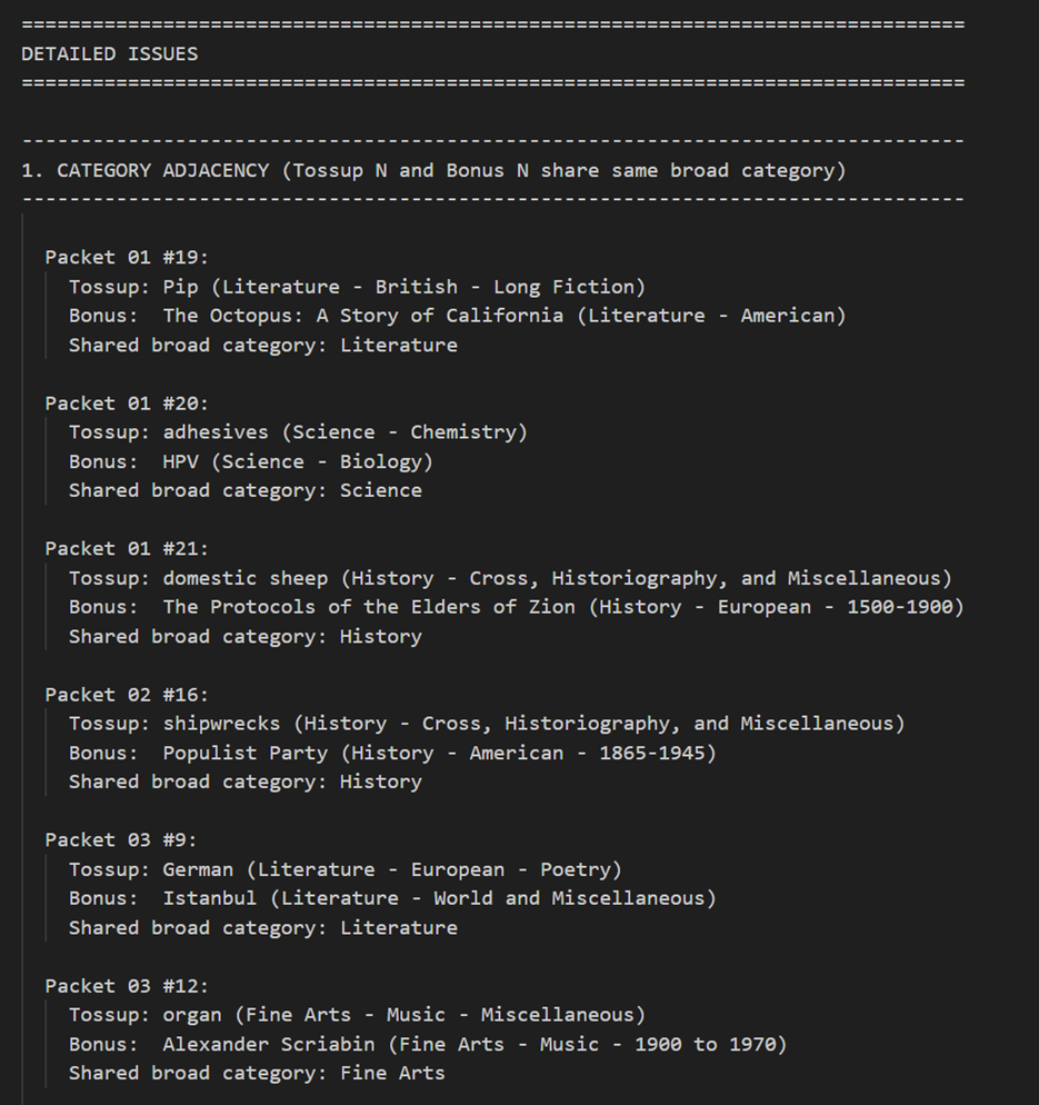 One could also use tools like Claude Code to build a simple app that takes a tossup or bonus and does intelligent searches of question databases to flag clues that could be out of place. For instance, this app could know what difficulty level you’re targeting. It could be instructed to do searches for proper nouns and other especially buzzable clues, as well as variations that may not appear in an exact match search. It could filter out irrelevant results that match the same words but are on different subjects.