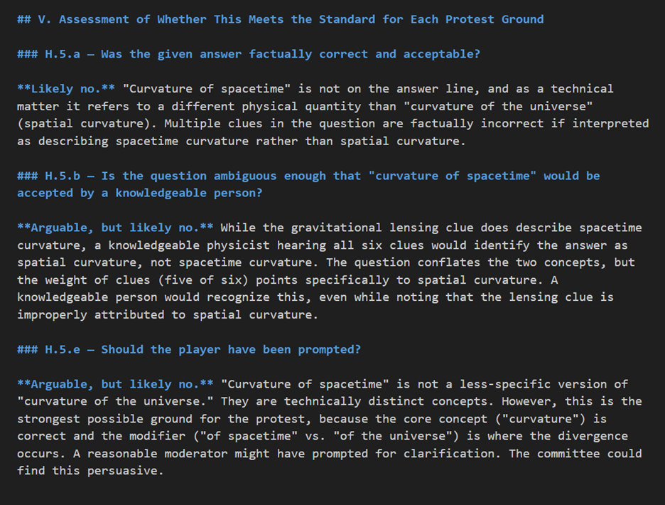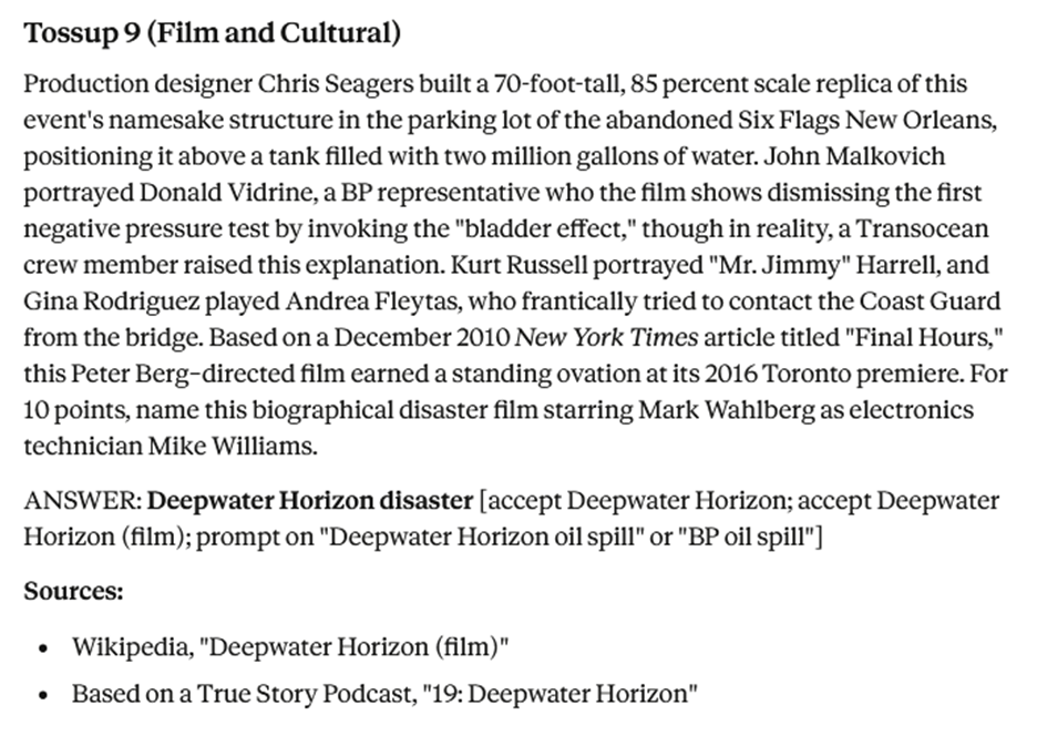 But even this tossup, more towards the good end of LLM output, isn’t perfect. You can see at the for 10 points that it loses some of the thread of what it’s asking about (not a “biographical disaster film” but instead the real event). It drops “BP representative” in the second clue, followed shortly thereafter by “Transocean crew member.” The Kurt Russell clue does not have an identifier and is almost certainly harder than the one before it.