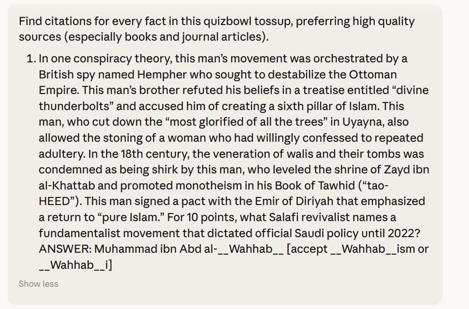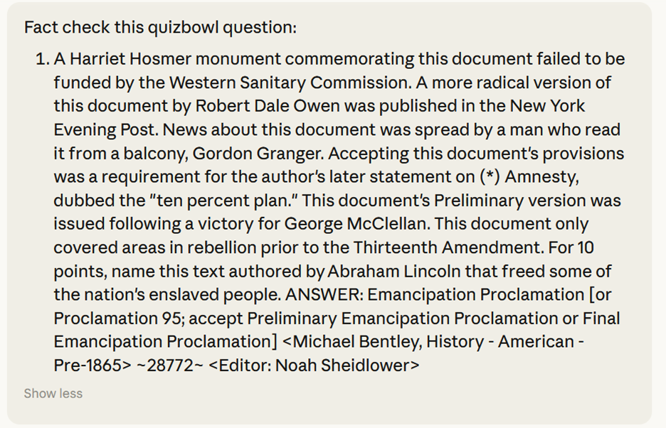 Style guide adherence: If your tournament has a style guide, feeding it to the LLM and asking it to find and fix violations for a packet can be effective. You could also attempt to tell the LLM that it should follow guidelines of a well-defined quizbowl style guide such as Ophir Lifshtiz’s quizbowl manual of style.