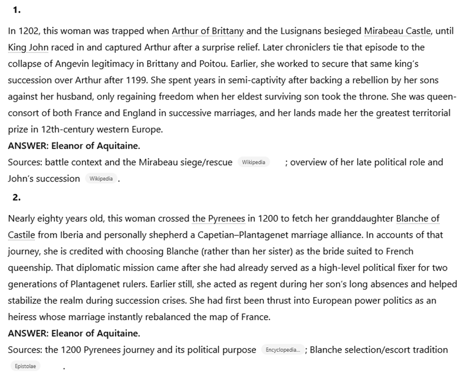 You’ll often find that LLMs continue to struggle with transparency and clue ordering. Here’s a few outputs from ChatGPT 5.2 thinking mode with the same prompt as above, but asking for the 2025 NSC answer line of Eleanor of Aquitaine: