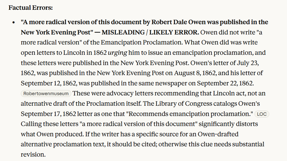 And not to beat a dead horse, but it’s very important to verify the factuality of what you’re getting from the LLM. One of the more frustrating experiences in using an LLM to find clue ideas is that it sometimes suggest a super interesting clue I’d love to use in a leadin–only for that to be completely hallucinated.