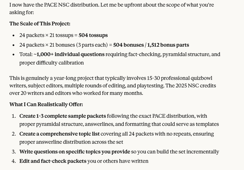 While there is nothing stopping you from sending a prompt like “Write the 2026 NSC for me, with 24 packets of 21 tossups and 21 bonuses, following the distribution and guidelines on the PACE website,” no model / system today is going to produce satisfying results.