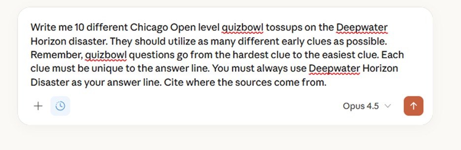 Sort of, but with lots of caveats. Frontier models have certainly got to a point where they can easily produce questions that a surface level look like a human wrote them. In an example discussed in more detail below, a relatively simple prompt to Claude’s Opus 4.5 model produced this reasonably decent themed tossup on the Deepwater Horizon disaster as it appeared in film and TV: